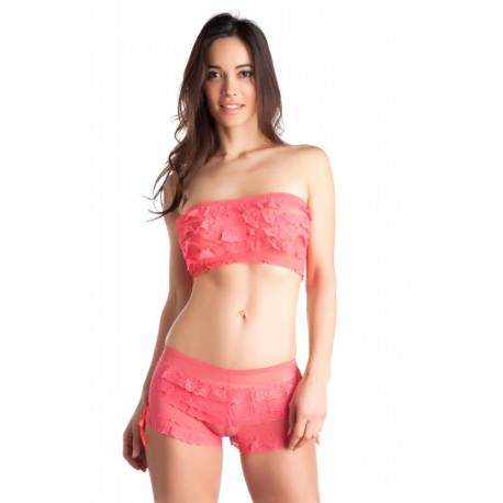 Soutien-gorge : forme bandeau jeu de superposition de dentelle Fermeture agrafée au dos surpiqûres contrastantes, Shorty: Nœud satiné décoratif sur les cotés fond doublé.Destinataire :